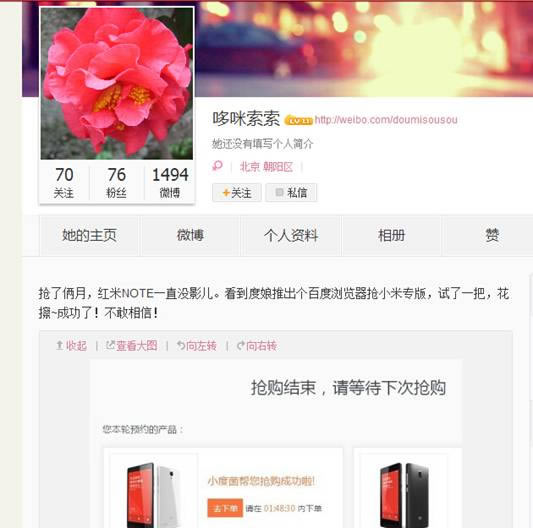 “抢了两月,红米NOTE一直没影儿,今天看到度娘推出个百度浏览器抢小米专版,试了一把,花擦~成功了!不敢相信!”网友“哆咪索索”是成功用百度浏览器抢小米专版抢得心仪产品的人之一,她还同时晒出了抢购后的截图,引来不少网友羡慕, “只听说过抢票,没听过还能抢手机呢。”网友“菩提下的女子”的跟帖称。