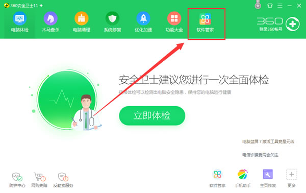 1、首先我们打开360安全卫士,然后在顶部的功能选项中打开“软件管家”;