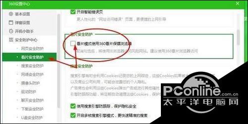 5、点击安全防护模式以后再右面会弹出一个新的窗口,有个选项,看片模式使用360看片保镖浏览器;