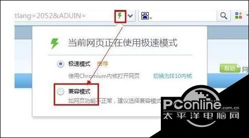 3、出现以上问题时,当然不止以上问题,还可能出现其他问题。此时您只需要将360浏览器的浏览模式修改为兼容模式即可实现正常的网页浏览器。点击地址栏右侧的图标,然后选择“兼容模式”;