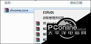 2、进入解压出来的文件夹中,找到“chrome.core”,对其右键,在弹出的菜单中选择“解压到chrome.core”,若中间出现错误提示,点击关闭即可;