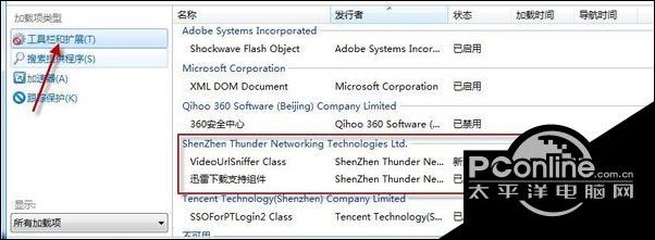 3、选择管理加载项,查看是否有迅雷控件,并且都启用了。