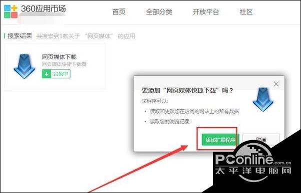 4、进入360应用市场后,在搜索框中输入“ 网页媒体 ”,点击搜索,然后在搜索结果中点击“安装”,之后弹出提示“ 要安装添加“网页媒体快捷下载“吗? ”, 点“ 添加扩展程序 ”添加扩展程序即可