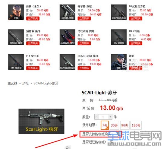 1.首先进入cf道具城然后在点击商品列表选择一款可以用购物点购买的武器,注:有些武器是不可以使用购物点购买的。