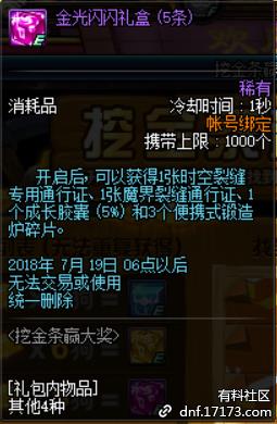 金光闪闪礼盒(5条)开启后,可以获得1个时空裂缝专用通行证、1张魔界裂缝通行证、1个成长胶囊(5%)和3个便携式锻造炉碎片