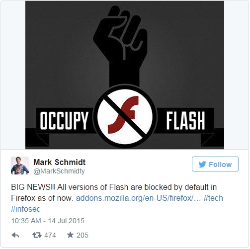 火狐团队主管马克·施密特(Mark Schmidt)通过Twitter证实,这款浏览器已经在最新的一次更新中屏蔽了所有版本的Flash播放器。