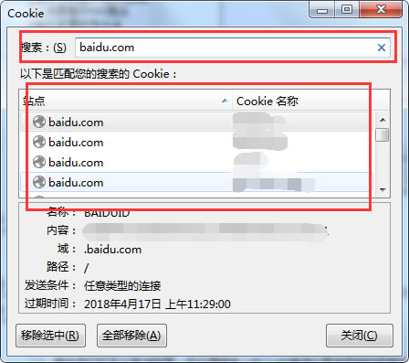 4、点击“查看cookie”按钮,在新弹出的界面就能看到所有的cookie了,我们还可以通过搜索框来查找指定的cookie。另外还可以在这里清理cookie。