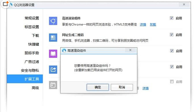 选择 菜单-QQ浏览器设置-扩展工具,点击“高速渲染组件”的安装,安装完成后会自动启用
