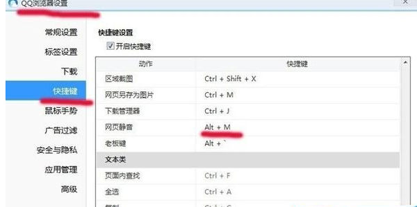 4、进入到快捷键设置,里面有一个关闭网页声音的快捷键,默认为ALT+M组合键,也可以设置一个常用的快捷键,如图4所示: