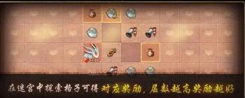 大人消耗幻金沙后可进入迷官。在迷宫中探索不同的格子可获得对应奖励。点击特殊格子可触发各种特殊效果。探索需要消耗迷宫行动力。大人在进入迷宫时将获得一定量的行动力,每次进入下一层也将回复少量行动力。随着层数的增加探索奖励也将更好(最高可达8层)。行动力为0时,本轮探索将终止,可再次花费幻金沙重新开启新的一轮迷宫。