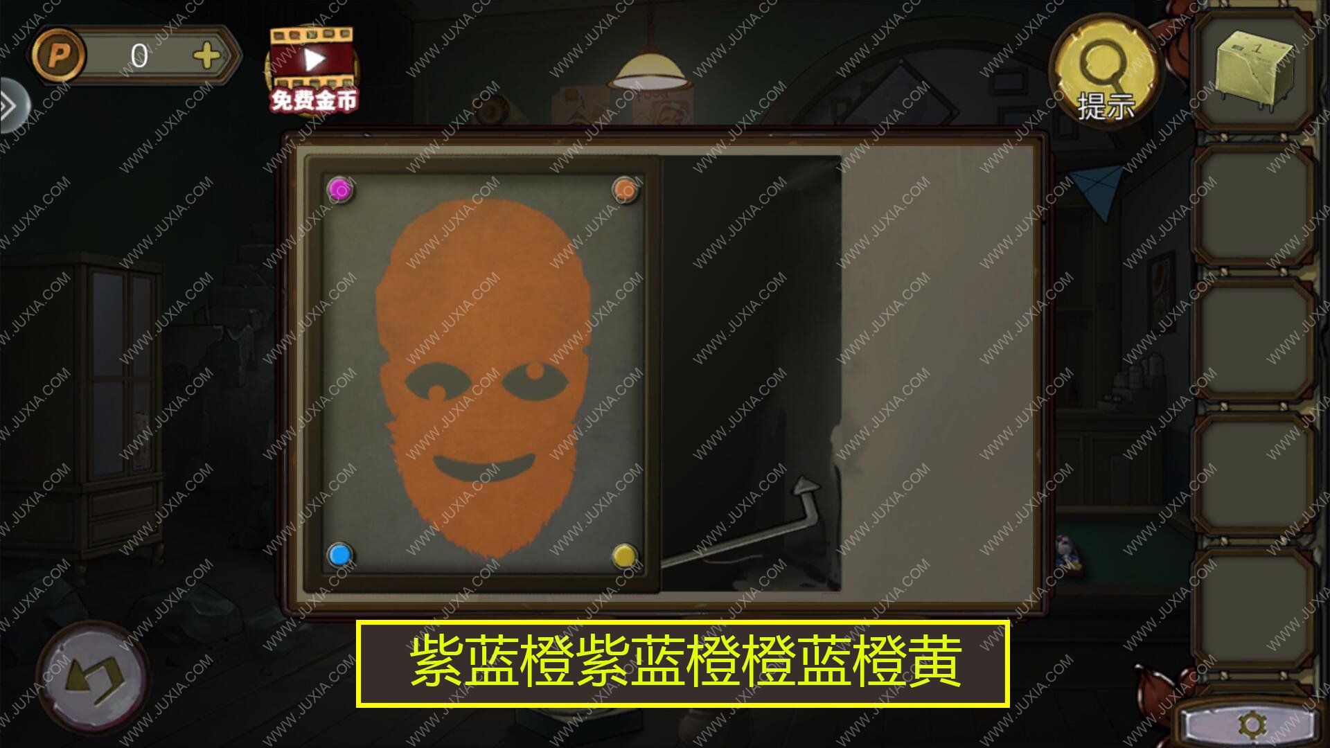 17.点击吧台右侧墙上的挂画,放入【黄色按钮】,根据小镇招牌的字母颜色,按顺序点击按钮:紫蓝橙紫蓝橙橙蓝橙黄。获得【把手】。17.1、17.2