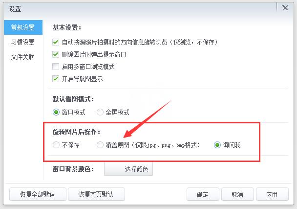 5、在“设置”界面的“常规设置”中找到“旋转图片后操作”,在这里可以勾选上“覆盖原图”,这样等旋转完图片后就不用我们去手动点击保存了。