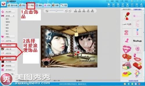既然是情侣合照,当然要精心装饰下才行啊,这里可以点击饰品,选择又可爱又酷的饰品添加上去,既可爱又浪漫!