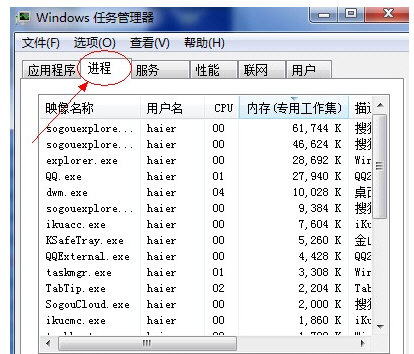 1、打开任务管理器,选择“进程”选项卡;