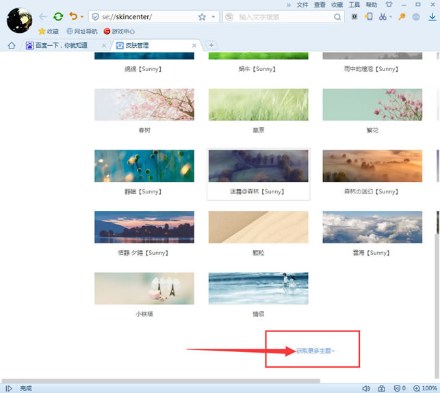 2、接着我们滑动到皮肤设置界面的底部,然后点击“获取更多主题”来到搜狗浏览器的皮肤中心;