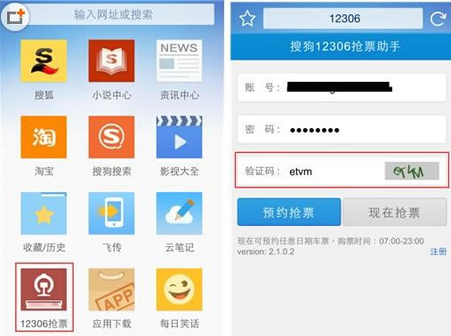 使用搜狗手机浏览器进行“一键约票”的操作十分简单,打开搜狗手机浏览器(安卓、iOS端均可),点击“12306抢票”功能,进入登录界面。值得一提的是,在登陆环节,搜狗手机浏览器会智能进行分析,自动填写12306网站的验证码,帮助大家节省了繁琐的输入过程。