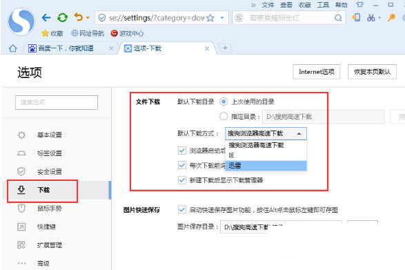 4、来到选项界面后找到“下载”分类,然后在右边的“文件下载”中,将“默认下载方式”更换成“迅雷”就可以了;