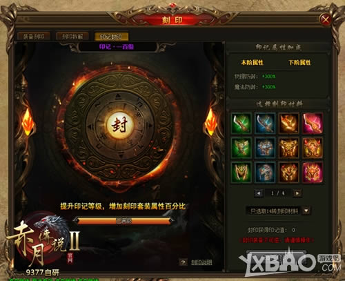在9377《赤月传说2》里,多余的刻印材料可以进行回收封印,升级印记等级。玩家在游戏中提升印记等级可以增加刻印套装属性,最高可提高3倍。而回收刻印装备不可逆,请各位勇士谨慎操作。