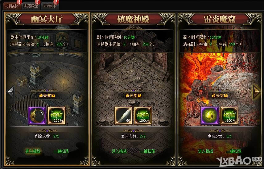 打副本的话自然首选副本卷轴了,目前,XY游戏《梁山传奇》材料副本分为6种,每种副本能进2次,每天总共能进11次副本。它们分别是幽冥大厅、镇魔神殿、雷炎魔窟、邪恶禁地、冰封圣域以及诅咒祭坛。而每个副本进入前都需要2张副本卷轴。