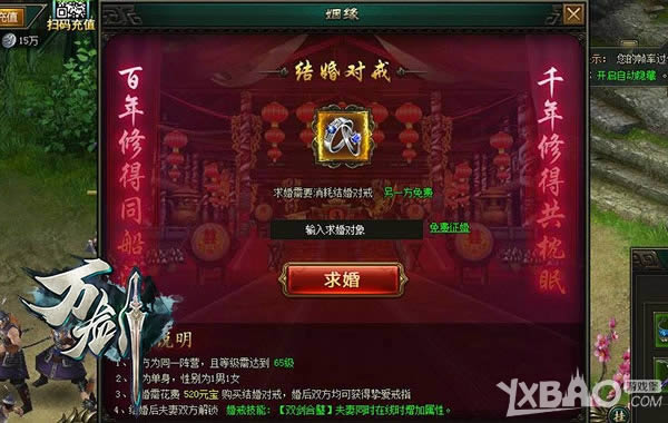 2、玩家成为游戏中的夫妻后,激活婚戒技能“双剑合璧”,还能享受同时在线战斗属性加成!