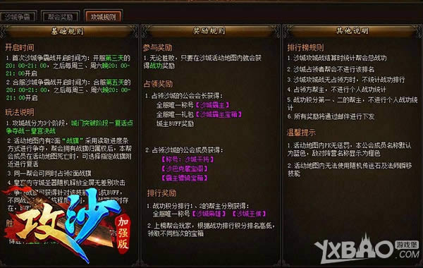 1、每周三、周六晚20:00-21:00是沙城战役的活动时间,各大帮会帮主带领自己的帮会成员进攻/防守沙城,截止活动结束,成功占领皇宫的帮会为沙城帮会,该帮会帮主则为沙城城主!